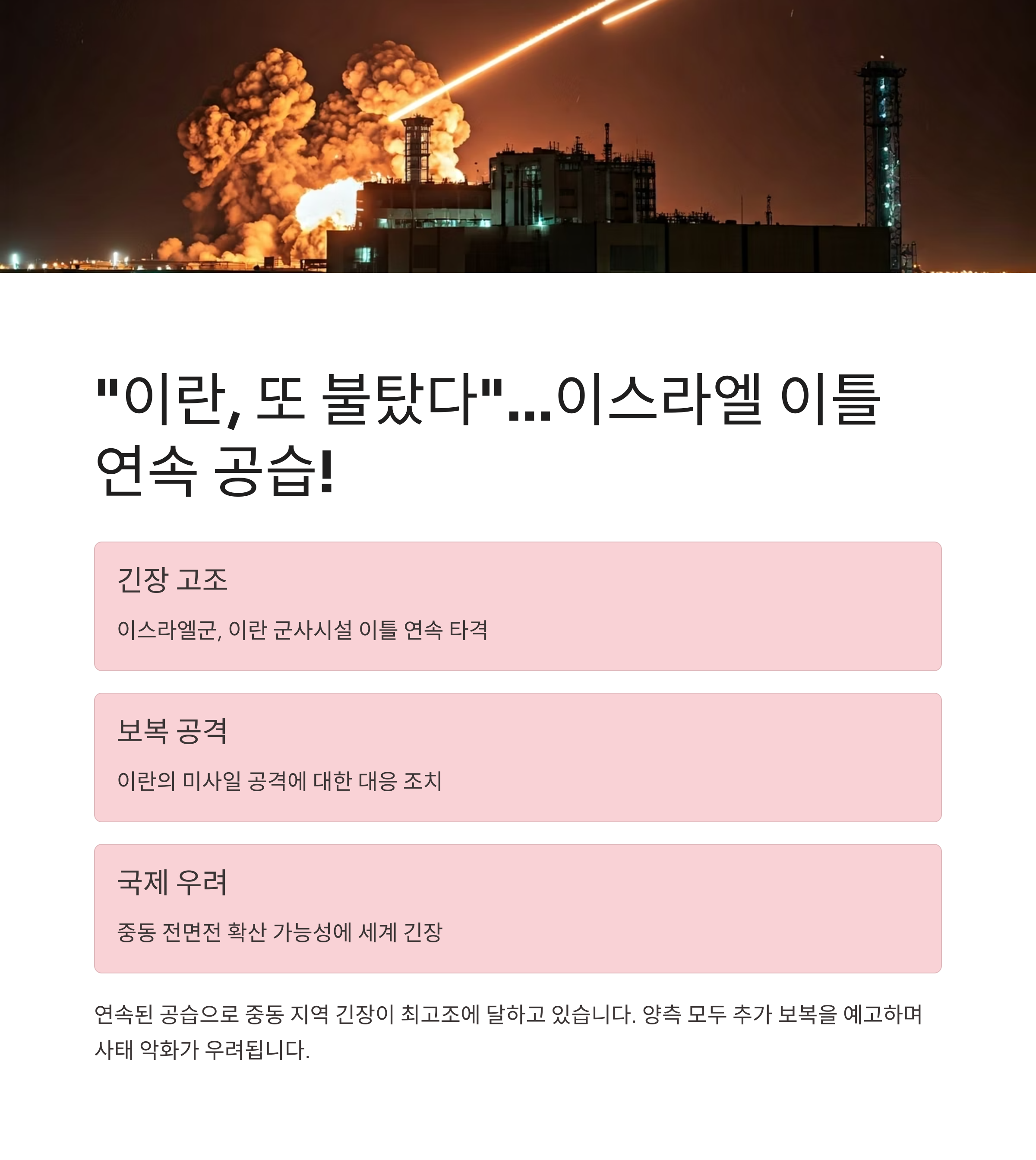 “이란, 또 불탔다”… 이스라엘 이틀 연속 공습! 미-이란 핵협상 ‘전격 취소’