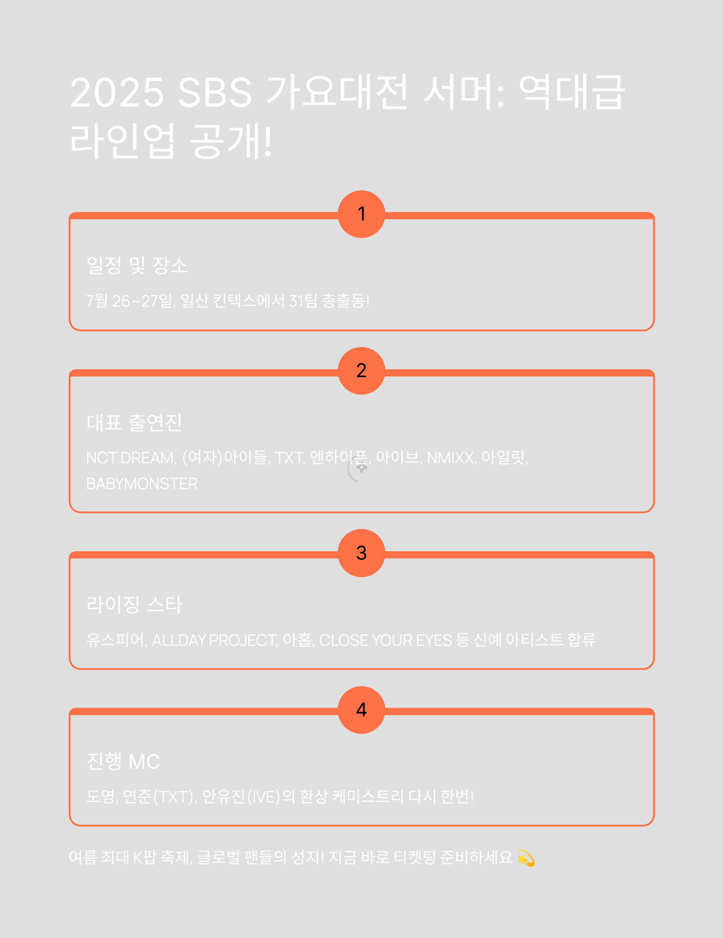 "내 최애 보러 가자!"SBS 가요대전 방청권, 공짜로 받는 '진짜' 꿀팁안녕하세요, 반짝이는 모든 것들을 사랑하는 '사랑'입니다. 올여름, 우리를 가장 설레게 하는 소식이 들려왔어요. 바로 K팝 최정상 아티스트들이 총출동하는 '2025 SBS 가요대전 서머'가 열린다는 소식이죠!그런데 이 황금 같은 축제의 방청권을, 그것도 무료로 받을 수 있는 기회가 있다면 믿으시겠어요? '놀유니버스'에서 통 큰 이벤트를 열었는데요, VIP가 아니어도, 오늘 막 가입한 신규회원도 바로 참여할 수 있는 '비밀 꿀팁'이 있답니다. 오늘 저 '사랑'이 여러분의 손에 방청권을 쥐여드린다는 마음으로, 그 모든 방법을 A to Z까지 알려드릴게요! 👇 1초라도 빨리! 방청권 응모하러 가기 역대급 라인업, 2025 SBS 가요대..