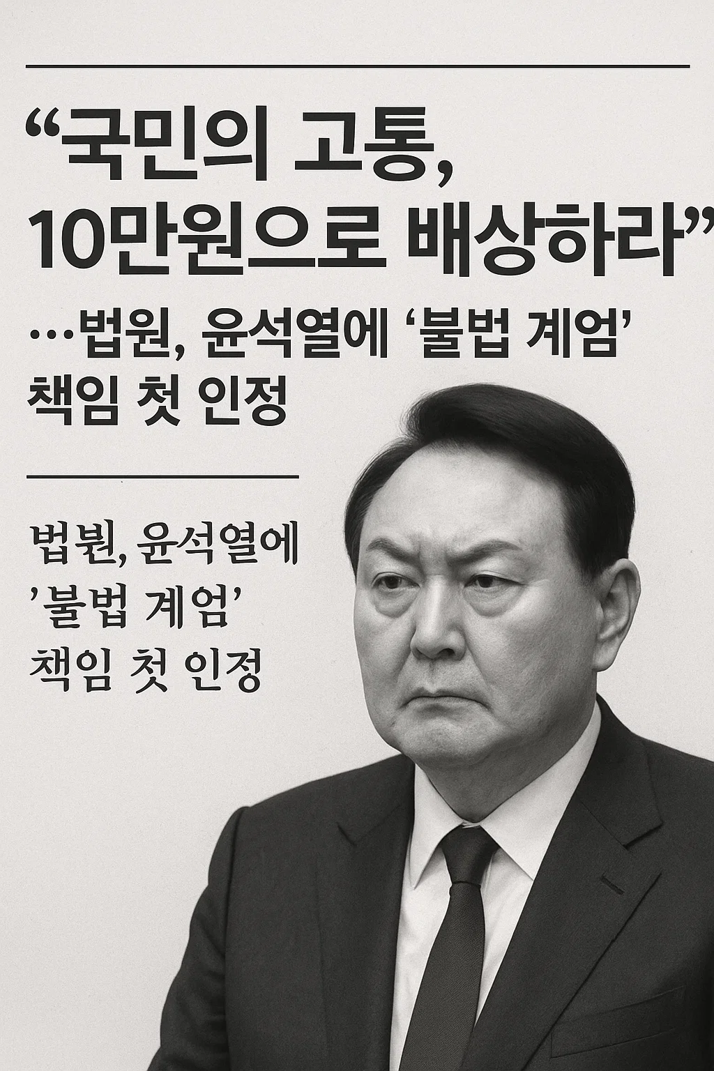 "국민의 고통, 10만 원으로 배상하라"... 법원, 윤석열에 '불법 계엄' 책임 첫 인정발행일: 2025년 07월 25일 | 작성자: 진실의 눈2024년 12월 3일, 그날 밤의 공포와 불안을 기억하십니까? TV 화면을 가득 채웠던 '비상계엄'이라는 네 글자에 느꼈던 그 참담함에 대해, 드디어 법원의 첫 판단이 나왔습니다. 전직 대통령 윤석열 씨가 불법 계엄으로 정신적 피해를 입은 국민들에게 위자료를 지급해야 한다는, 작지만 의미 있는 판결입니다.이것은 단순한 10만 원의 문제가 아닙니다. 국가의 최고 권력자가 국민에게 저지른 불법 행위에 대해 법원이 처음으로 '책임'을 인정한 역사적인 사건입니다.법원의 판단: "명백한 고의에 의한 불법행위"서울중앙지법 이성복 부장판사는 판결문에서 윤석열 전 대통령의 ..