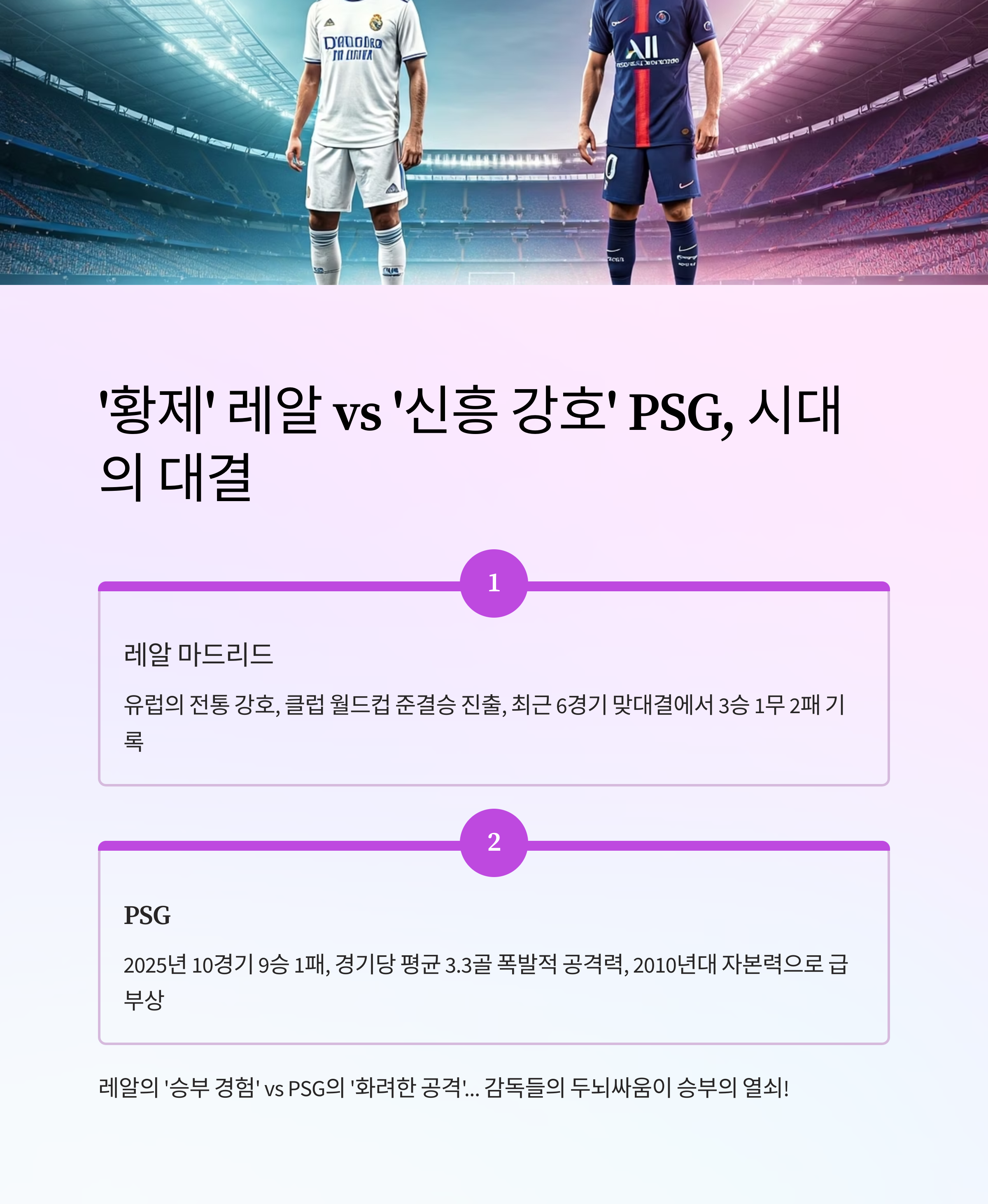 안녕하세요, 우리 삶의 모든 드라마를 사랑하는 '사랑'입니다. 만약 축구가 한 편의 영화라면, 오는 10일 펼쳐질 레알 마드리드와 파리 생제르맹(PSG)의 클럽월드컵 4강전은 단연코 올여름 최고의 블록버스터일 거예요. '황제'의 귀환과 '새로운 왕'의 탄생, 그리고 그 중심에 선 '예상치 못한 영웅'의 이야기까지. 이 영화의 시나리오를 저와 함께 먼저 살짝 엿보실까요?