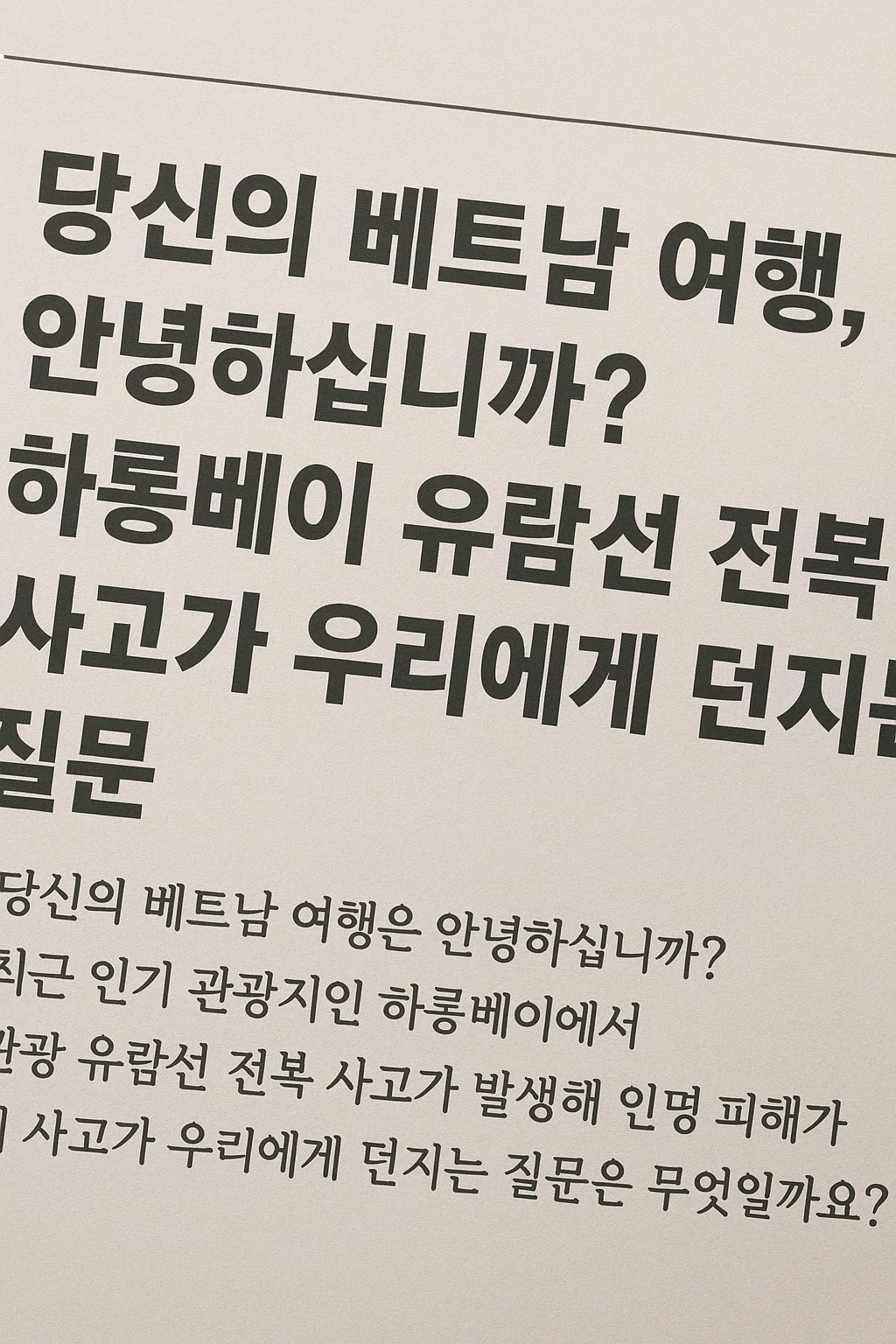어제(19일) 아침, 평화로운 주말을 보내던 우리에게 베트남에서 날아온 비보는 큰 충격과 안타까움을 안겼습니다. 세계적인 관광지이자 '바다의 구이린'이라 불리는 아름다운 하롱베이에서 발생한 유람선 전복 사고 소식입니다. 즐거운 추억을 쌓기 위해 떠났던 여행객들이 한순간에 목숨을 잃거나 실종되었다는 사실에 마음이 무겁습니다. 이번 사고를 통해 우리는 '여행의 안전'에 대해 다시 한번 깊이 생각해 보게 됩니다.