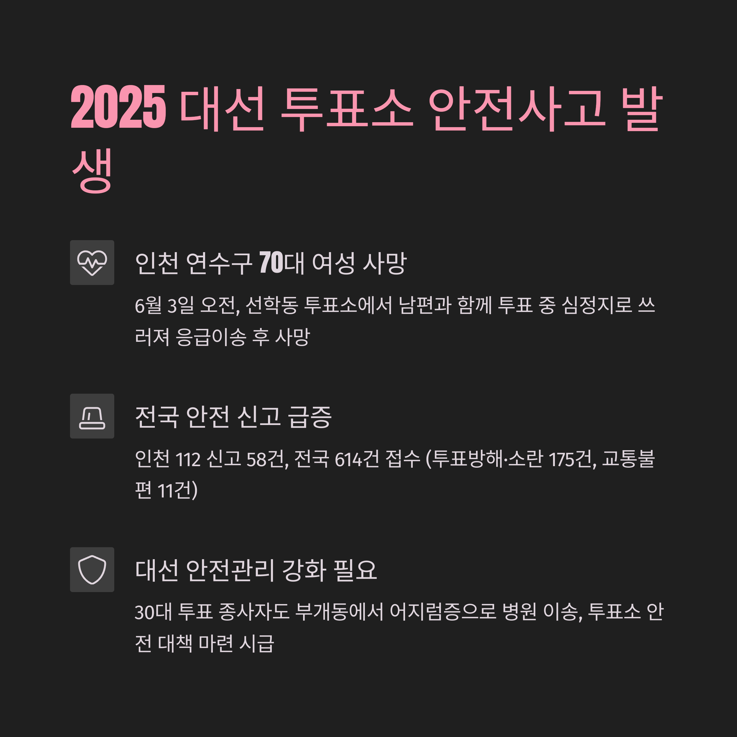 [투표현장] 인천 투표소 70대 사망2025 대선 안전 이슈 총정리제21대 대통령선거 당일, 인천에서 안타까운 사고 소식이 전해졌습니다.투표 현장 안전과 주요 신고 현황까지 한눈에 정리해 드립니다.✔️ 사건 한눈에 보기인천 선학동 투표소에서 70대 여성 쓰러져 병원 이송 후 사망오전 9시 59분, 신고 후 119구급대가 현장 출동같은 날 부평구 부개동 투표소, 30대 투표요원 병원 이송대선 관련 신고 46건 접수: 투표 방해·소란 13건, 교통 2건, 기타 31건인천 투표소 사고, 무엇이 있었나?2025년 6월 3일, 인천 연수구 선학동 대선 투표소에서 투표를 하러 온 70대 여성 A 씨가 갑자기 의식을 잃고 쓰러지는 사고가 발생했습니다. 신고를 받은 119 구급대가 즉시 출동했으나, 심정지 상태로 발견..